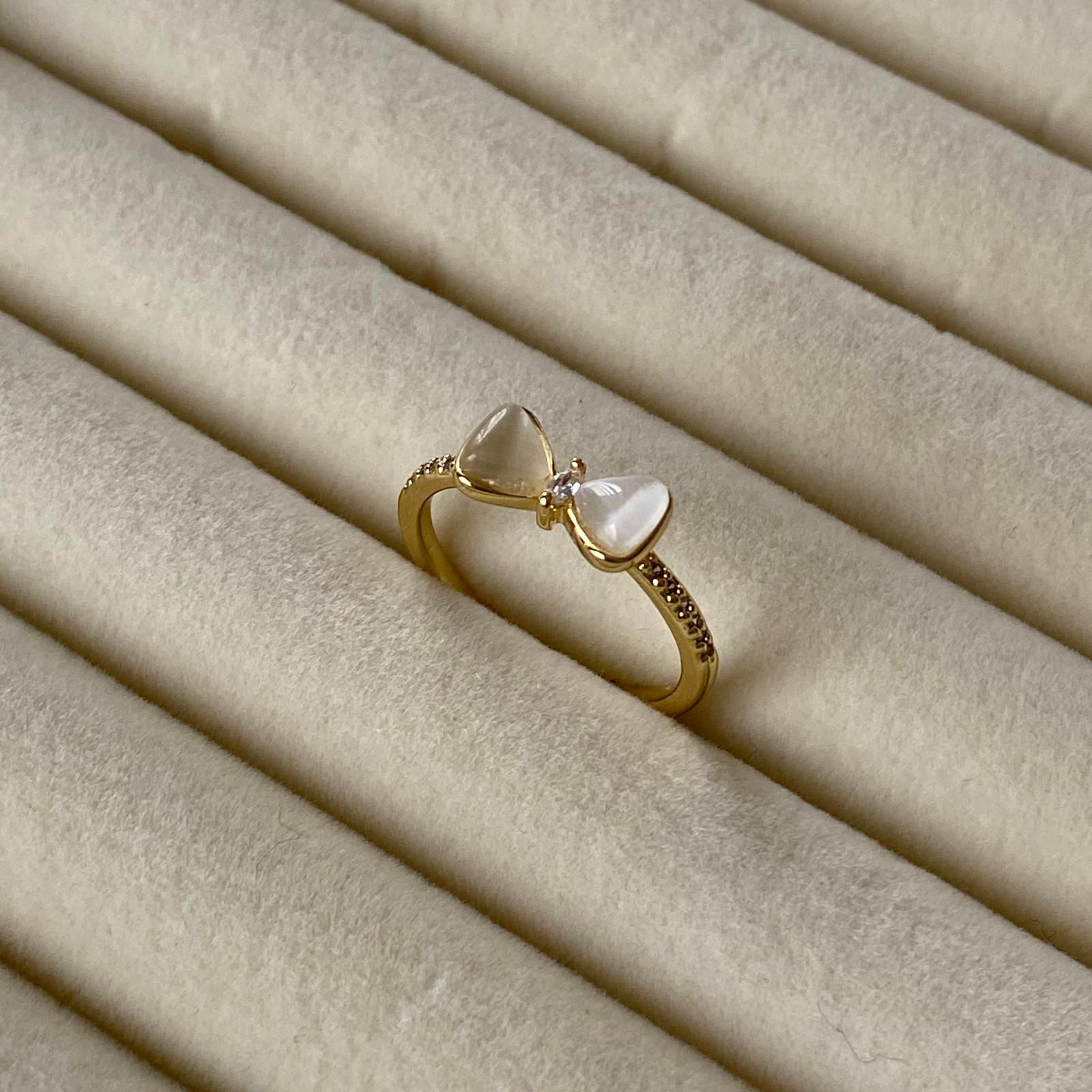 Bu zarif 14K altın kaplama özel tasarım kadın yüzük, üst kısmındaki iki parçalı fiyonk detayı ve kalp formuna yakın yumuşak hatlı taşlarıyla romantik ve şık bir görünüm sunar. Yüzük bandının üzerindeki minik ışıltılı taşlar tasarıma lüks bir dokunuş katarken, kaliteli kaplaması sayesinde kararma yapmaz, alerji oluşturmaz ve doğru kullanımda yıllarca ilk günkü parlaklığını korur.