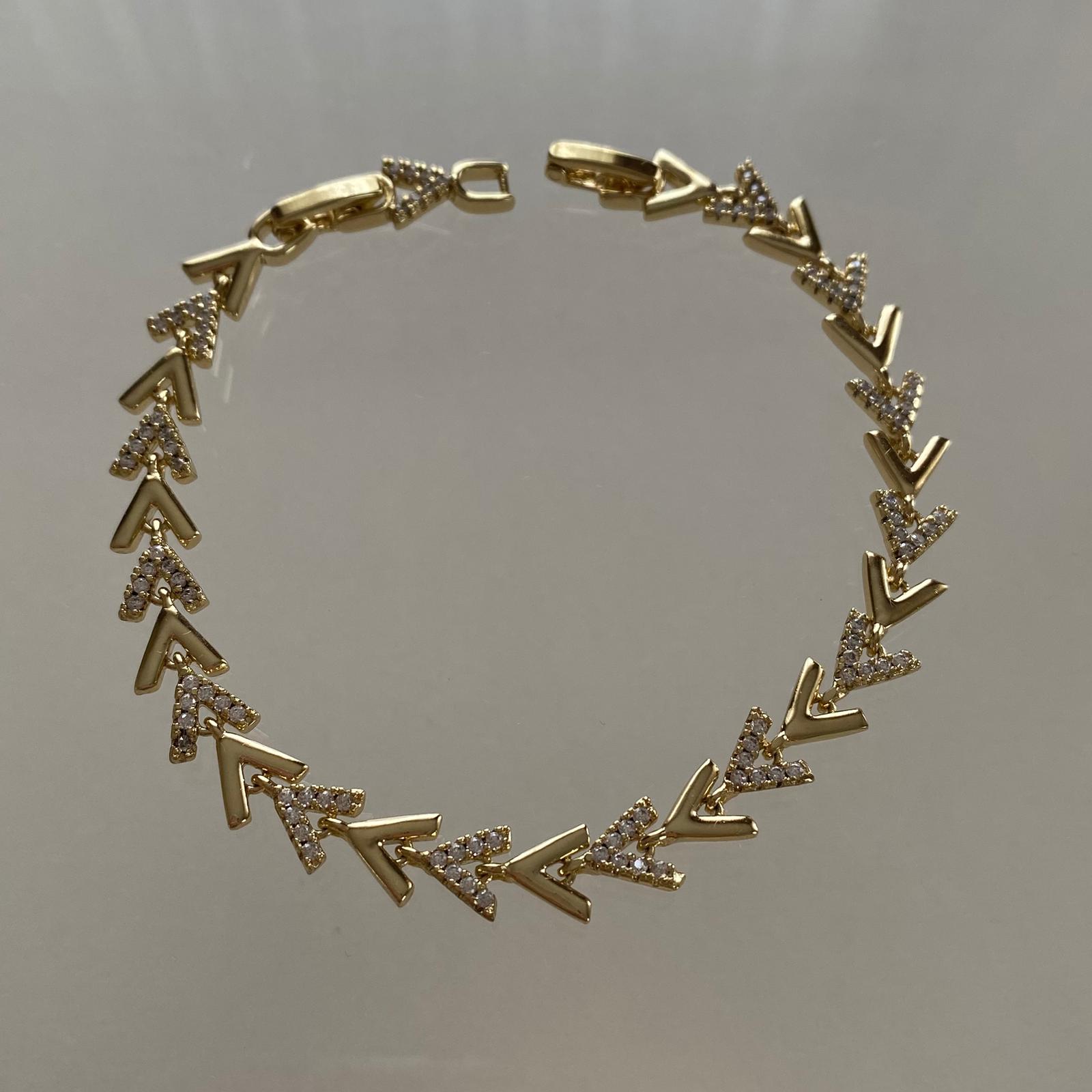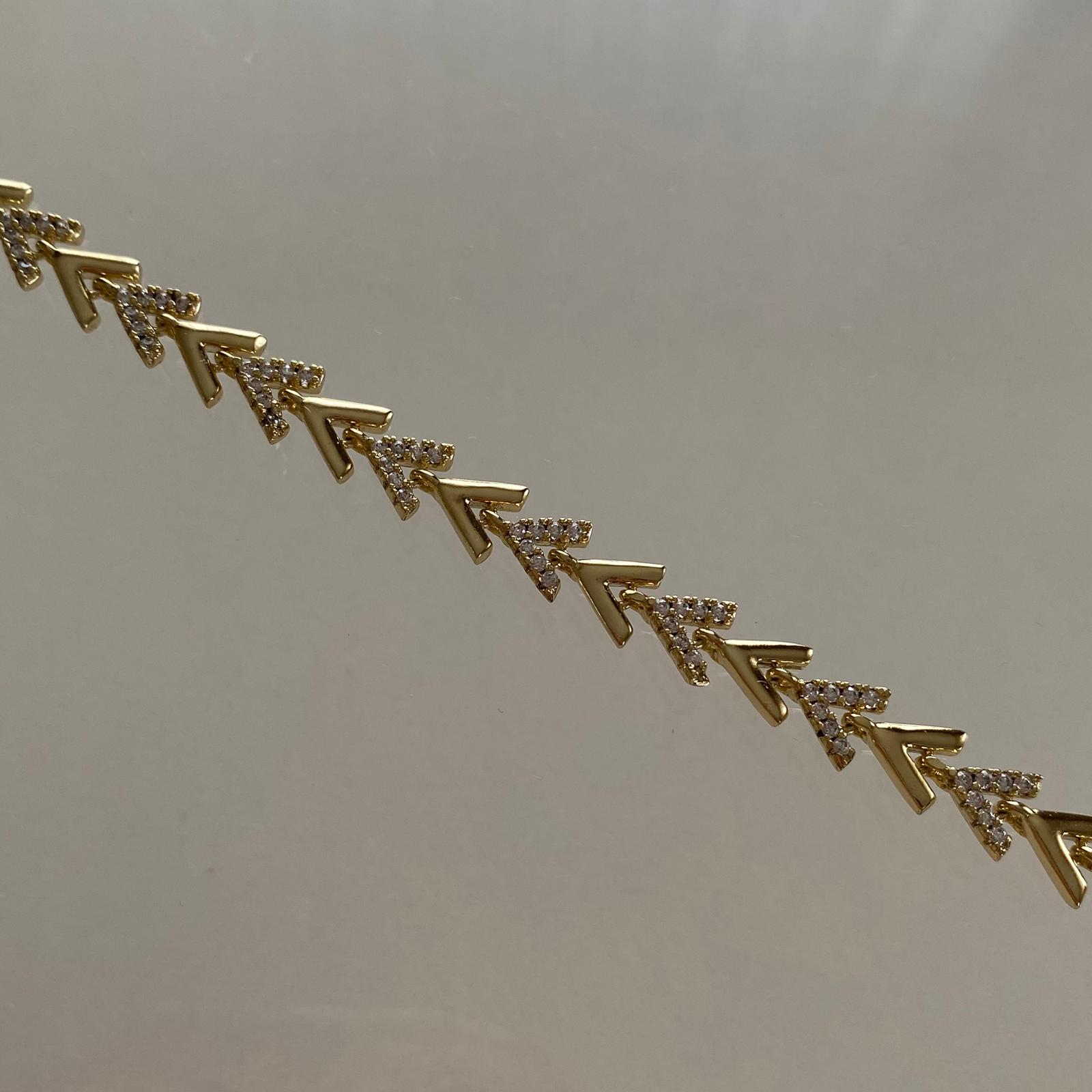 Bu zarif 14K altın kaplama özel tasarım kadın bileklik, uç uca eklenmiş ok ucu/V formundaki modern deseniyle bilekte son derece şık ve dikkat çekici bir duruş sergiler. Sıralı biçimde yerleştirilmiş düz ve taşlı ok motifleri, bilekliğe dinamik ve lüks bir ışıltı katarken, kaliteli kaplaması sayesinde kararma yapmaz, alerji oluşturmaz ve doğru kullanımda yıllarca ilk günkü parlaklığını korur.