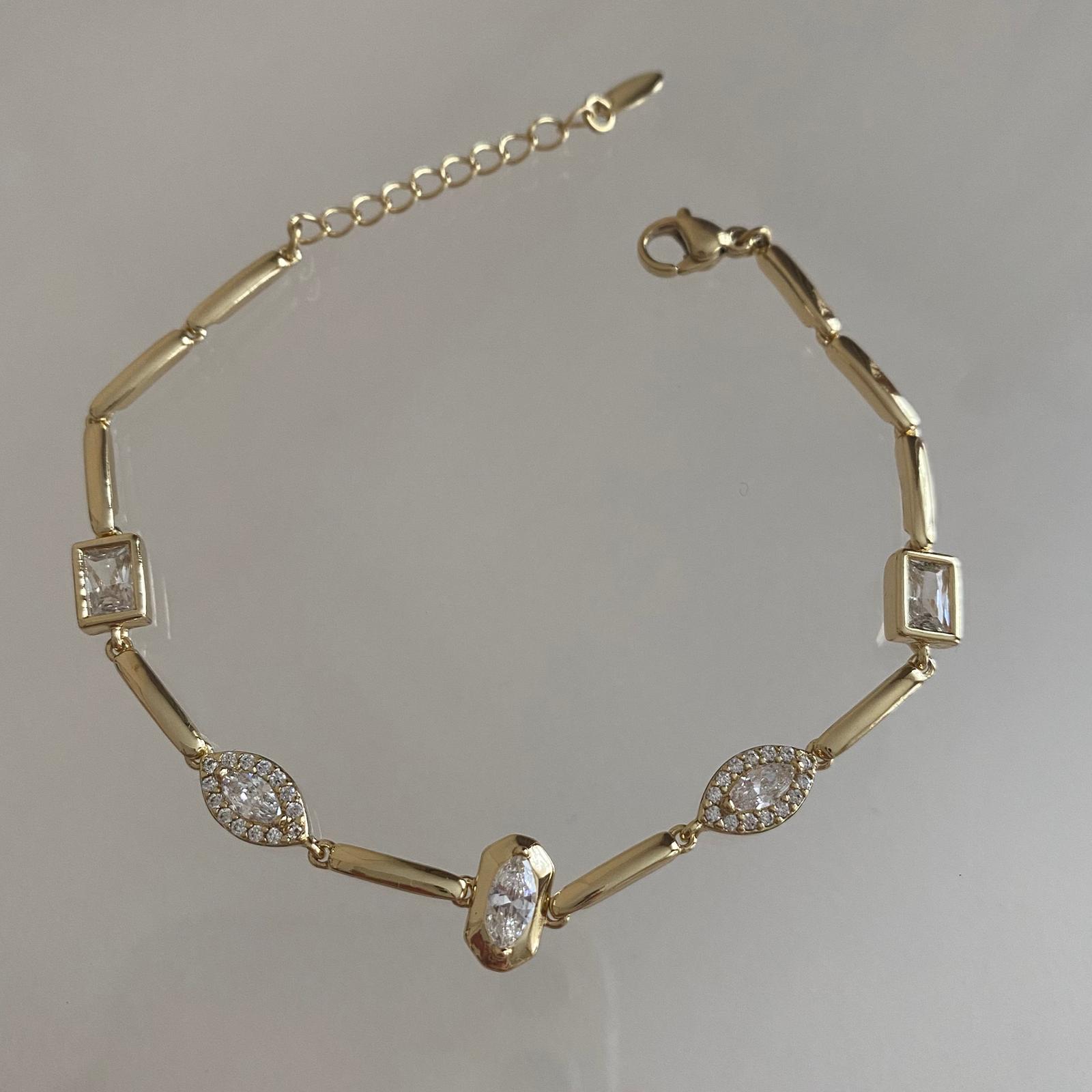 Bu zarif 14K altın kaplama özel tasarım kadın bileklik, bilek boyunca uzanan ince çubuk halkalar ve aralarına yerleştirilmiş baget, markiz ve oval form taş detaylarıyla modern ve şık bir görünüm sunar. Ortadaki oval taş ve yanlarındaki ışıltılı çerçeveli taşlar, bileklik hareket ettikçe ışığı yakalayarak bileğinizde son derece elegan bir ışıltı oluşturur.