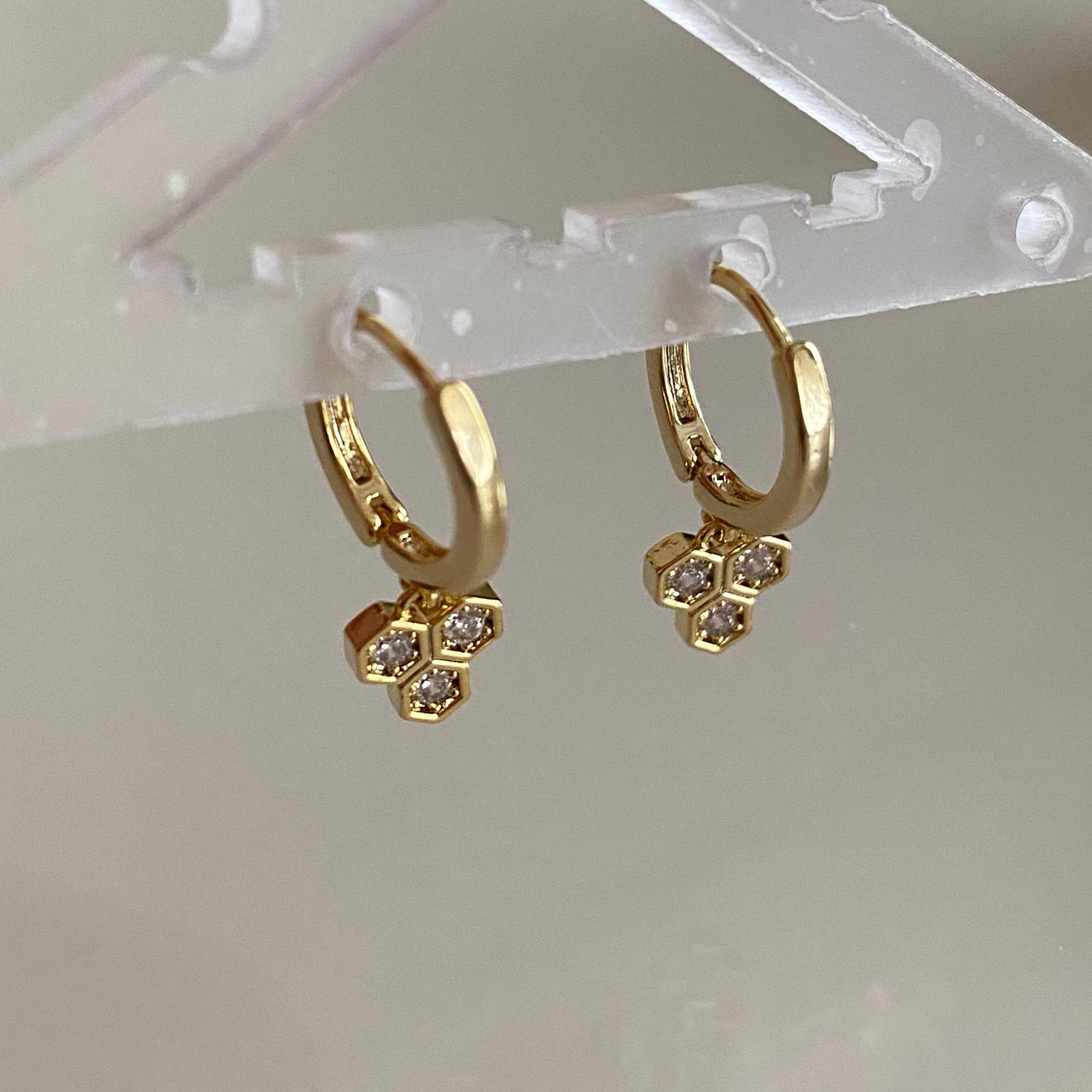 Bu zarif 14K altın kaplama özel tasarım bebek küpesi, küçük halka formu ve ucundaki üçlü taş detaylı bal petek motifli ucu ile minik kulaklarda son derece şık ve sevimli durur. Pırlanta efektli taşlar, küpe hareket ettikçe ışığı nazikçe yansıtarak bebeğinizin stiline zarif bir ışıltı katar. Hassas ciltler düşünülerek üretilen kaliteli kaplaması sayesinde kararma yapmaz, alerji oluşturmaz ve doğru kullanımda yıllarca ilk günkü parlaklığını korur.