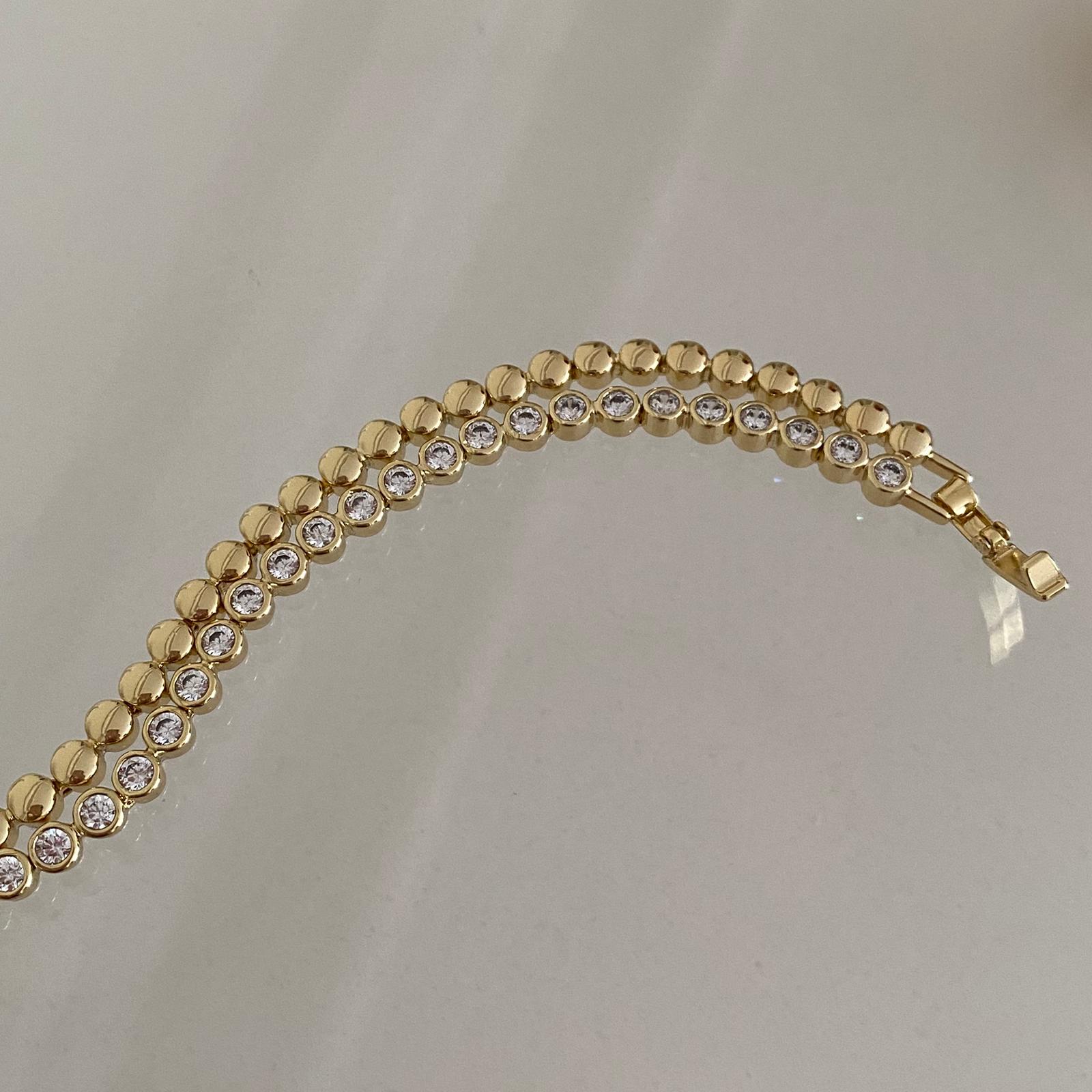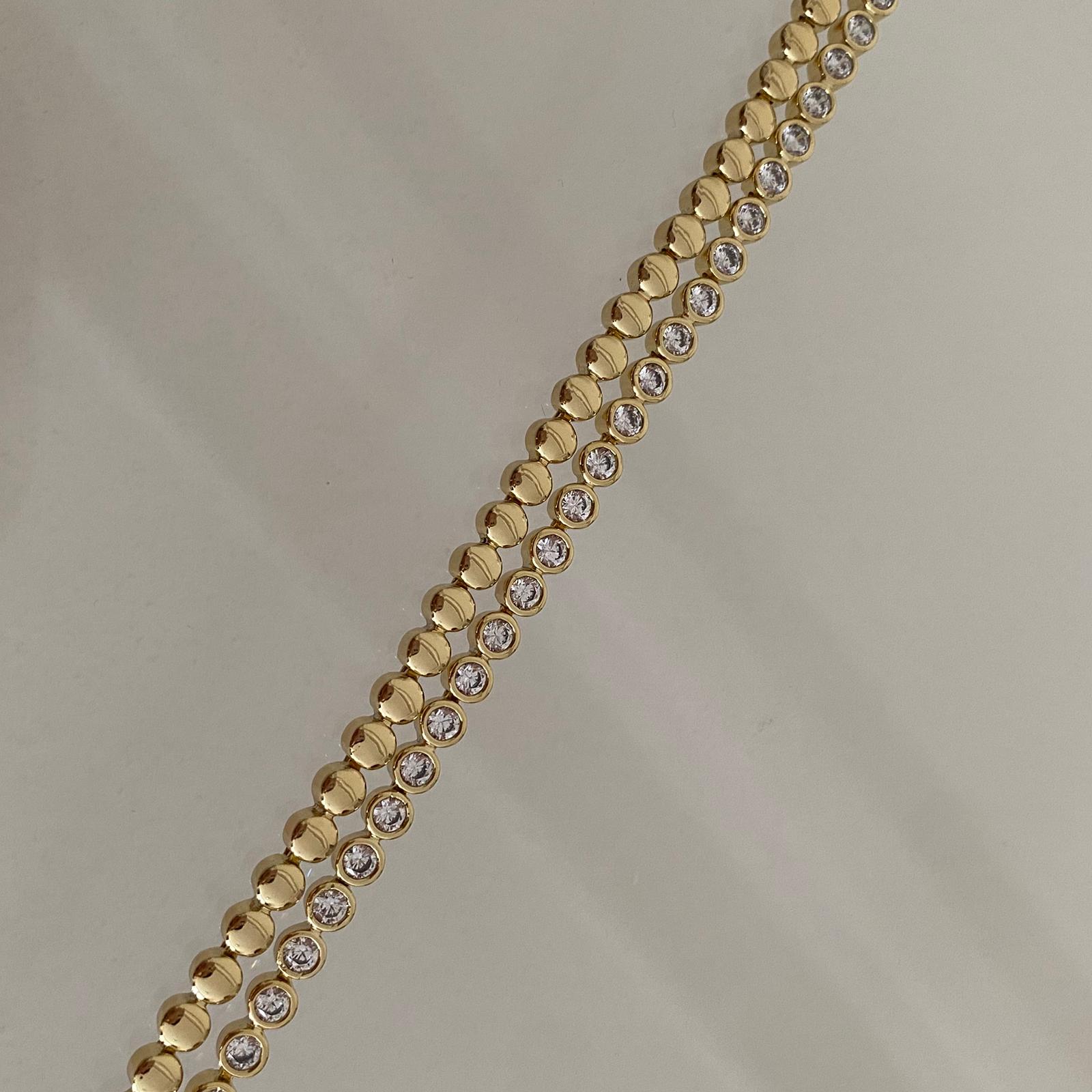 Bu zarif 14K altın kaplama özel tasarım kadın bileklik, bir yanında parlak gold yuvarlak formlar, diğer yanında ise pırlanta efektli yuvarlak taş dizilimiyle son derece şık ve modern bir görünüm sunar. Çift sıra yapısı bilekte dolgun ve zarif bir duruş oluştururken, ışıltılı taşlar her hareketinizde göz alıcı bir parlaklık kazandırır. Kaliteli kaplaması sayesinde kararma yapmaz, alerji oluşturmaz ve doğru kullanımda yıllarca ilk günkü parlaklığını korur.