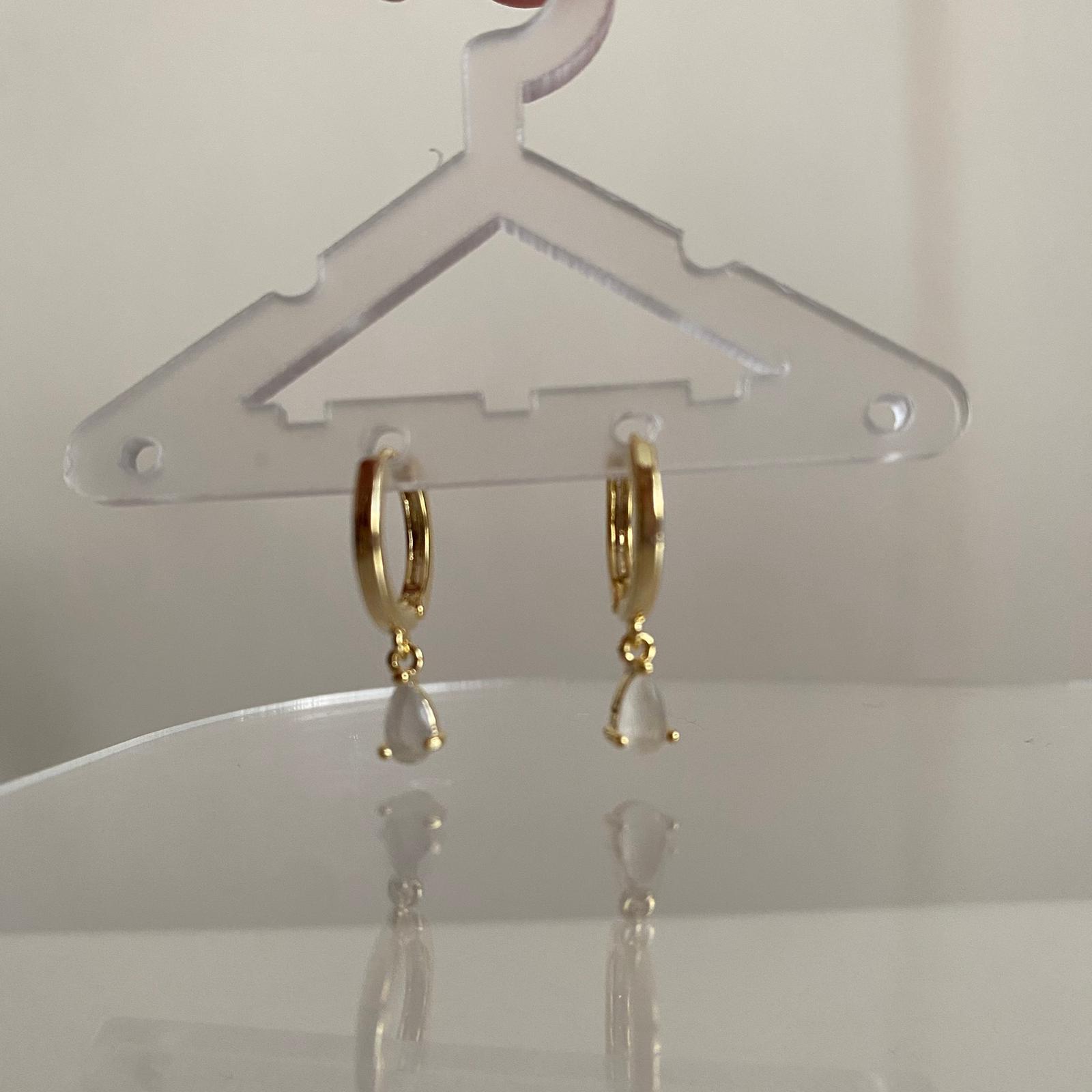 Bu zarif 14K altın kaplama özel tasarım bebek küpesi, küçük halka formu ve ucundaki şeffaf damla taş detayıyla minik kulaklarda sade ama çok şık bir görünüm sunar. Hafif sallantılı damla uç, küpe hareket ettikçe ışığı nazikçe yansıtarak bebeğinizin stiline zarif bir ışıltı katar.