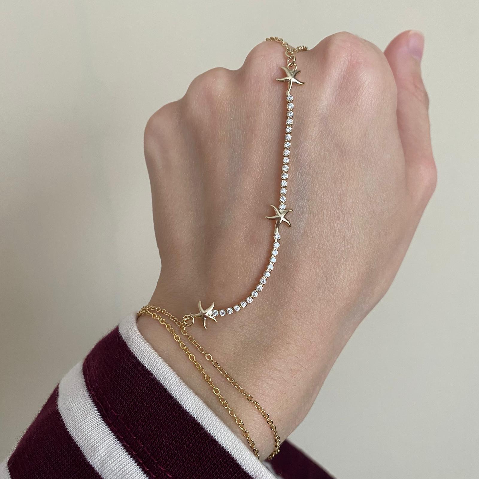 Bu zarif 14K altın kaplama özel tasarım şahmeran, bilekten parmağa uzanan ince zinciri, kavis şeklinde dizilmiş ışıltılı taşları ve üç adet yıldız figürüyle gökyüzü esintili feminen bir görünüm sunar. Elin üzerinde zarif bir S formu oluşturan taşlı kısım, her hareketinizde ışığı yakalayarak göz alıcı bir parlaklık sağlar; yıldız detayları ise tasarıma masalsı ve modern bir dokunuş katar.