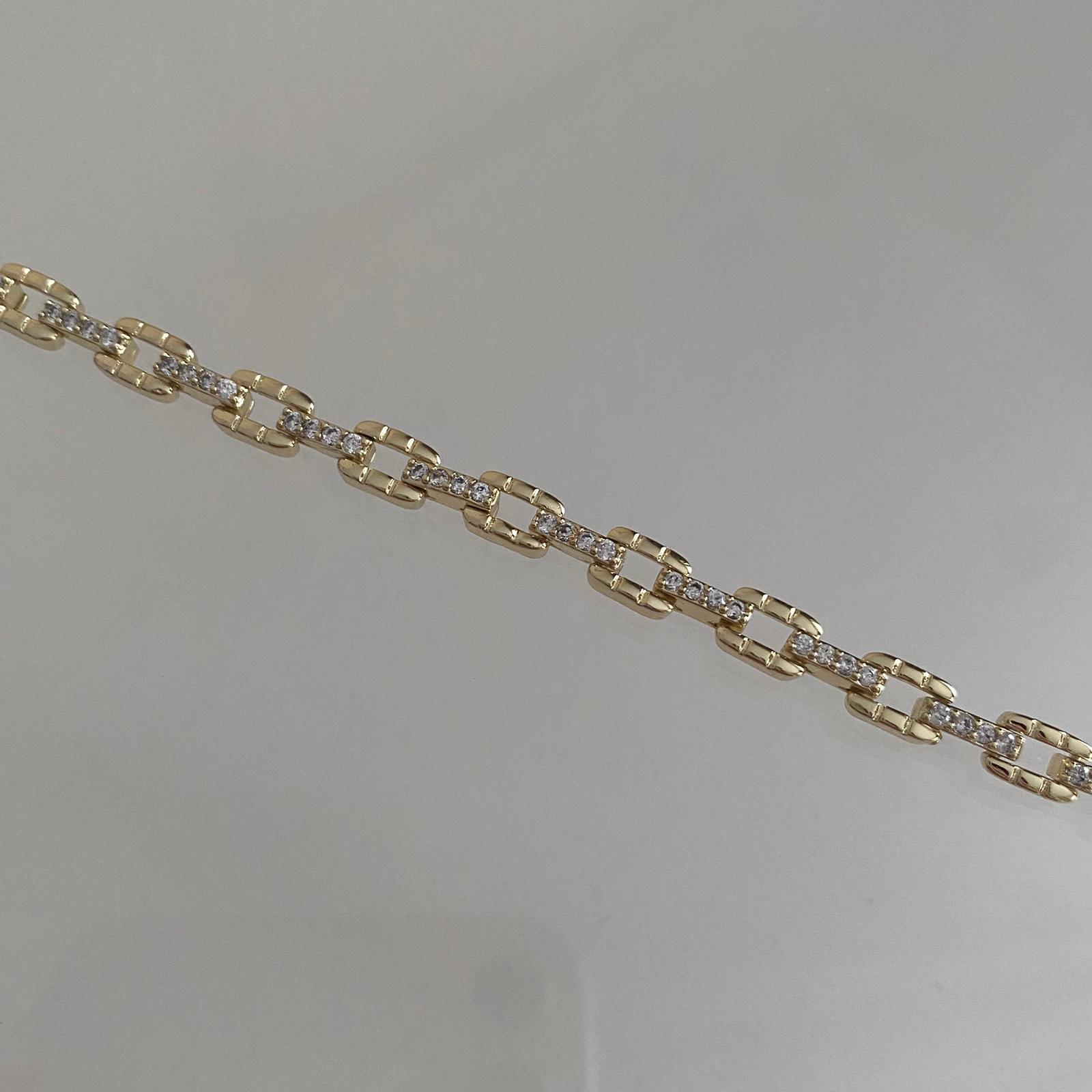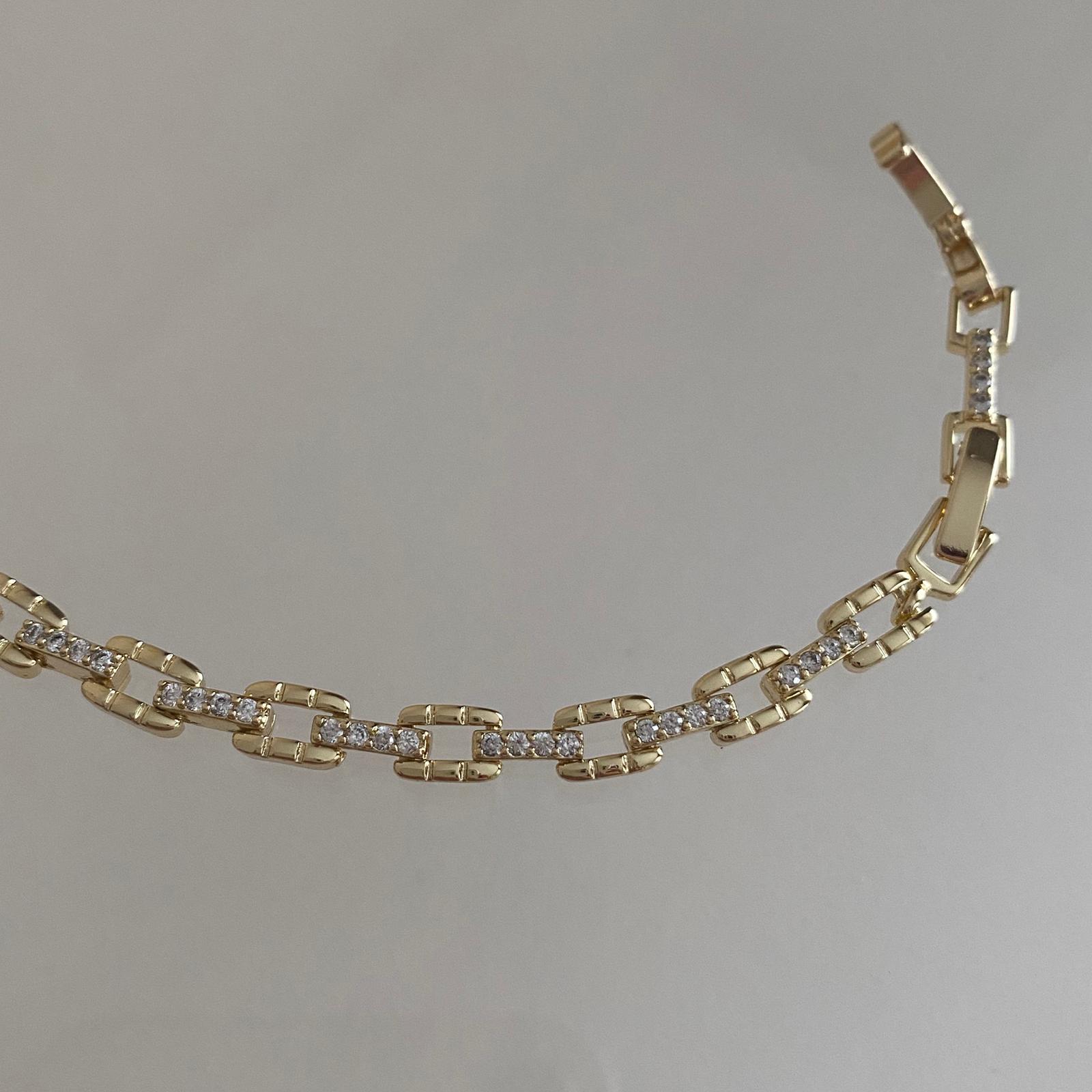 Bu zarif 14K altın kaplama özel tasarım kadın bileklik, bilek boyunca uzanan geometrik dikdörtgen halkalar ve aralarına yerleştirilmiş taşlı ince bağlantılarıyla modern ve şık bir görünüm sunar. Açık formdaki dikdörtgen halkalar bilekte zarif bir hat oluştururken, aradaki pırıltılı taş detayları her hareketinizde ışığı yakalayarak göz alıcı bir ışıltı verir.