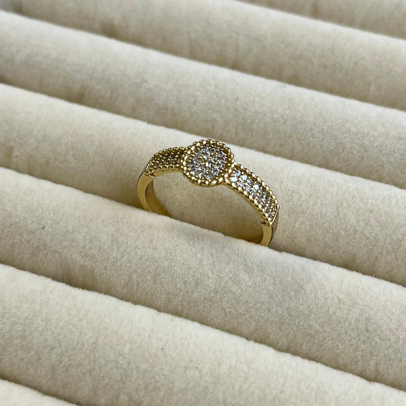 Bu zarif 14K altın kaplama özel tasarım kadın yüzük, üst kısmındaki yuvarlak halo formu ve etrafını saran minik taşlarla son derece ışıltılı bir görünüm sunar. Yüzüğün her iki yanına doğru devam eden sıra taş detayları, parmakta dolgun ve şık bir etki yaratırken ışığı her açıdan yakalayarak dikkat çeken bir parlaklık oluşturur.