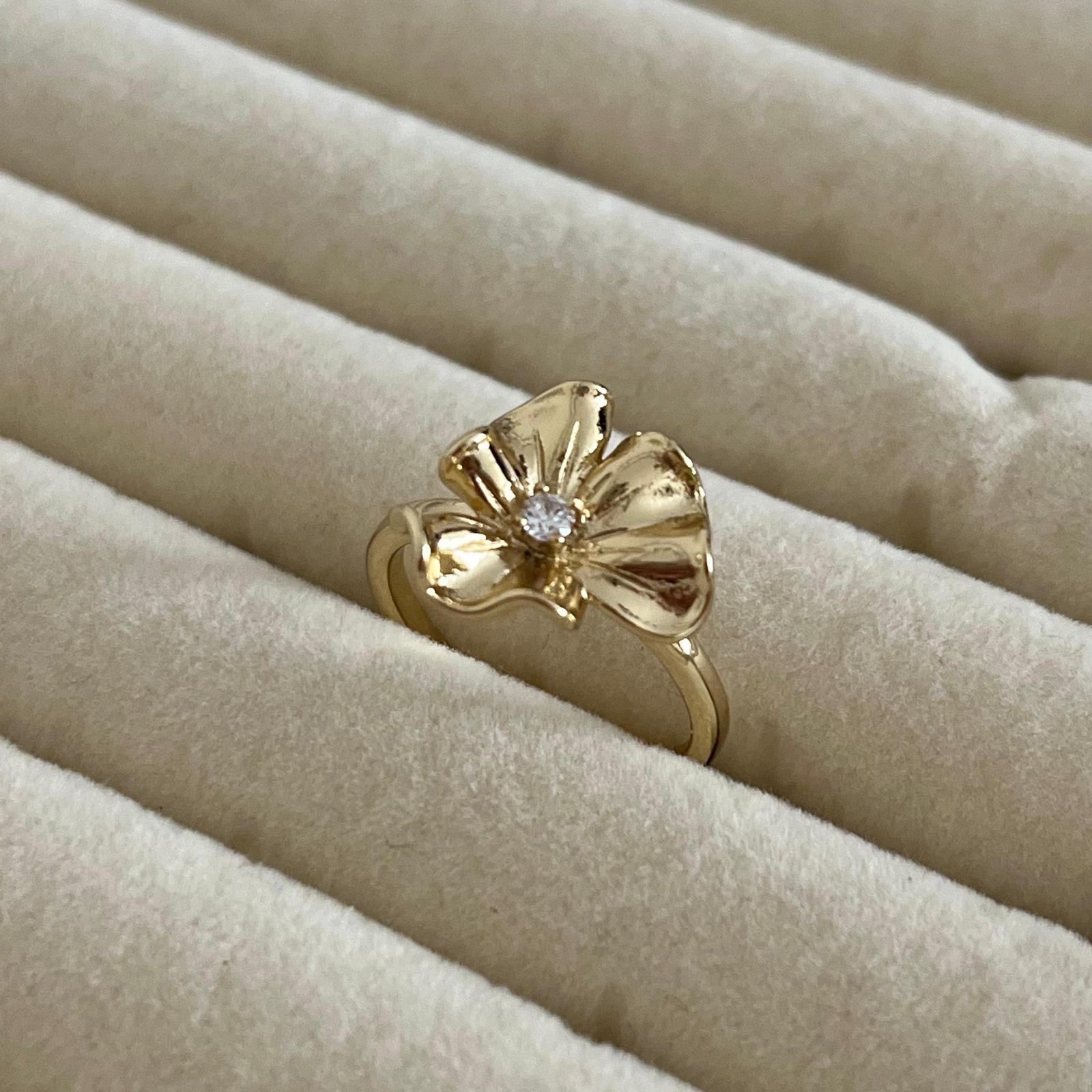Bu zarif 14K altın kaplama özel tasarım kadın yüzük, heykelsi kabarık çiçek formu ve çiçeğin tam ortasındaki parlak taş detayıyla feminen ve çok şık bir görünüm sunar. Dalgalı yaprak formundaki yüzey, ışığı farklı açılardan yakalayarak parıltıyı güçlendirir ve parmakta adeta minik bir çiçek açmış etkisi yaratır.