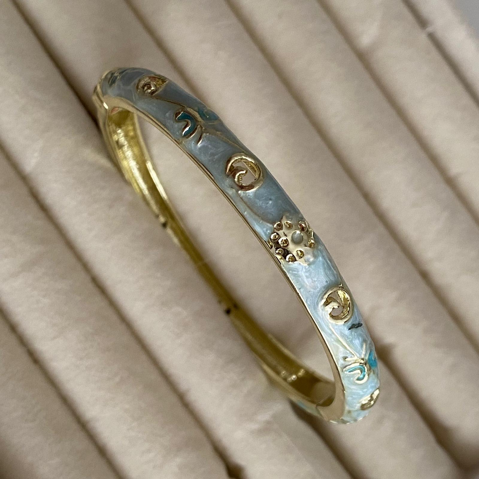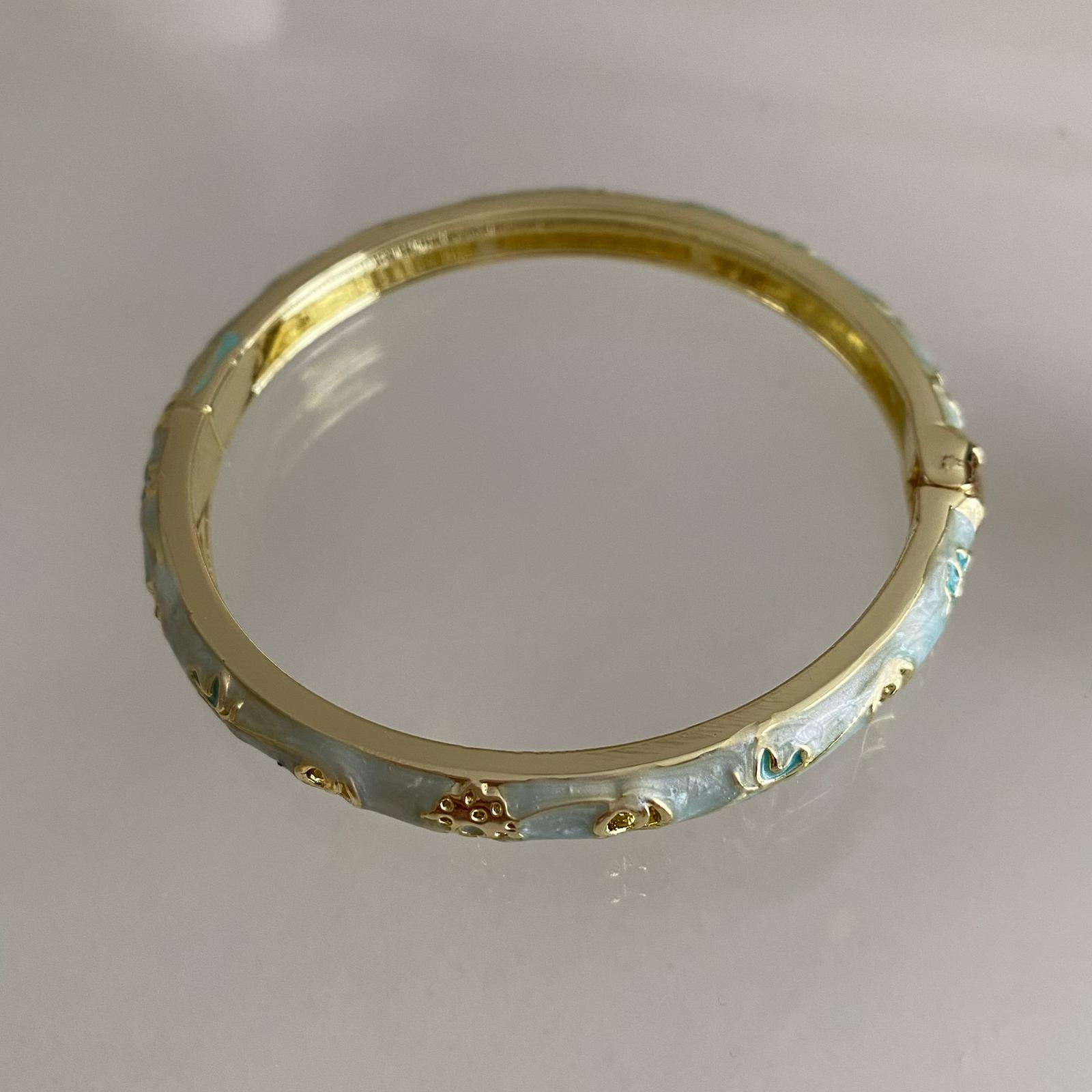 Bu zarif 14K altın kaplama özel tasarım kadın bileklik, pastel mavi mine kaplamalı yüzeyi ve üzerine yerleştirilmiş kabartmalı çiçek motifleriyle romantik ve dikkat çekici bir görünüm sunar. Renkli yüzey ile altın tonunun uyumu bilekte yumuşak ama iddialı bir ışıltı oluştururken, kaliteli kaplaması sayesinde kararma yapmaz, alerji oluşturmaz ve doğru kullanımda yıllarca ilk günkü parlaklığını korur.