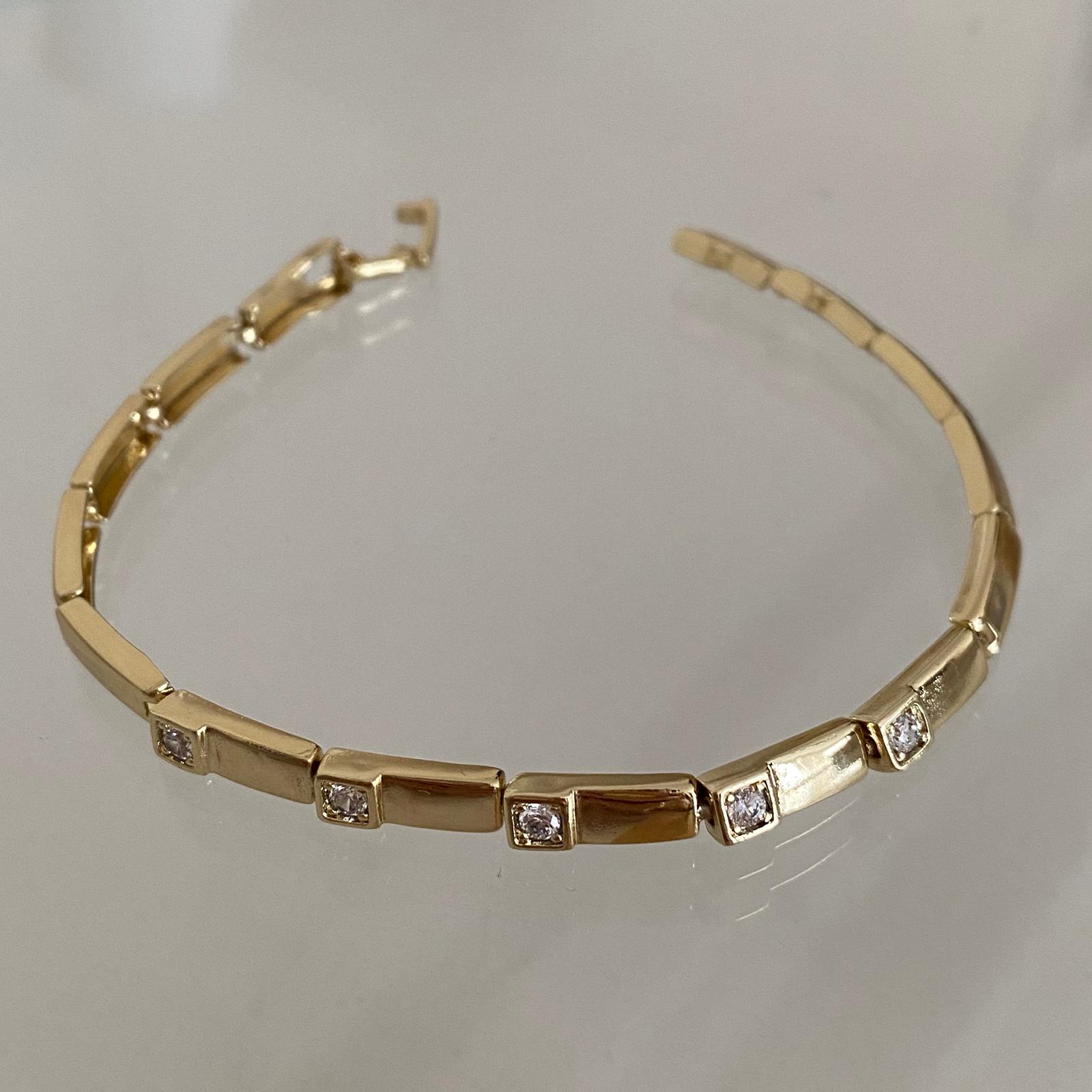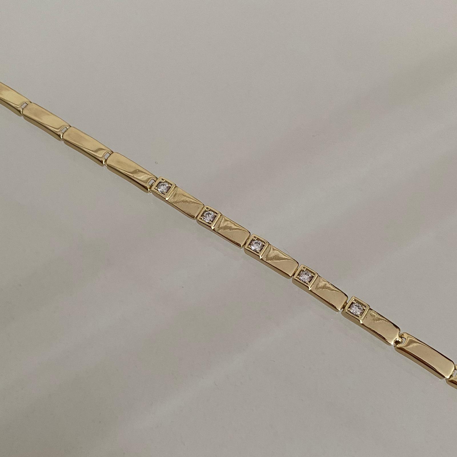 Bu zarif 14K altın kaplama özel tasarım kadın bileklik, bileklik boyunca sıralanan parlak dikdörtgen plakalar ve aralarına yerleştirilmiş ışıltılı taş detaylarıyla modern ve şık bir görünüm sunar. Geometrik formuyla bilekte düzgün ve zarif bir hat oluştururken, taşlı bölümler her hareketinizde ışığı göz alıcı şekilde yansıtır. Kaliteli kaplaması sayesinde kararma yapmaz, alerji oluşturmaz ve doğru kullanımda yıllarca ilk günkü parlaklığını korur.