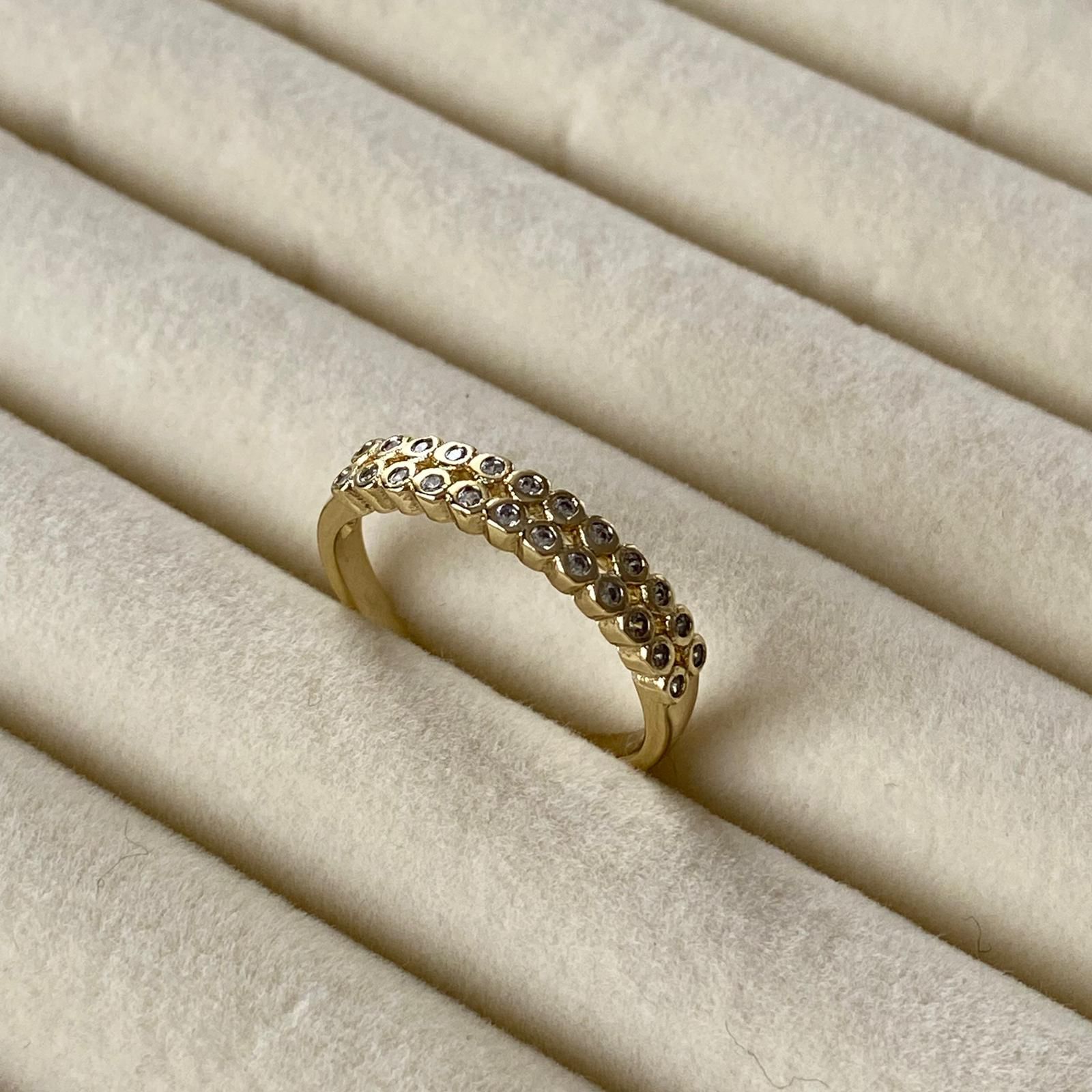 Bu zarif 14K altın kaplama özel tasarım kadın yüzük, üst kısmındaki ikili sıra kabartma nokta deseniyle sade ama modern bir görünüm sunar. İnce bant formu parmakta hafif ve zarif dururken, dokulu yüzeyi ışığı yumuşak bir şekilde yansıtarak günlük şıklığa şık bir dokunuş katar. Kaliteli kaplaması sayesinde kararma yapmaz, alerji oluşturmaz ve doğru kullanımda yıllarca ilk günkü parlaklığını korur.