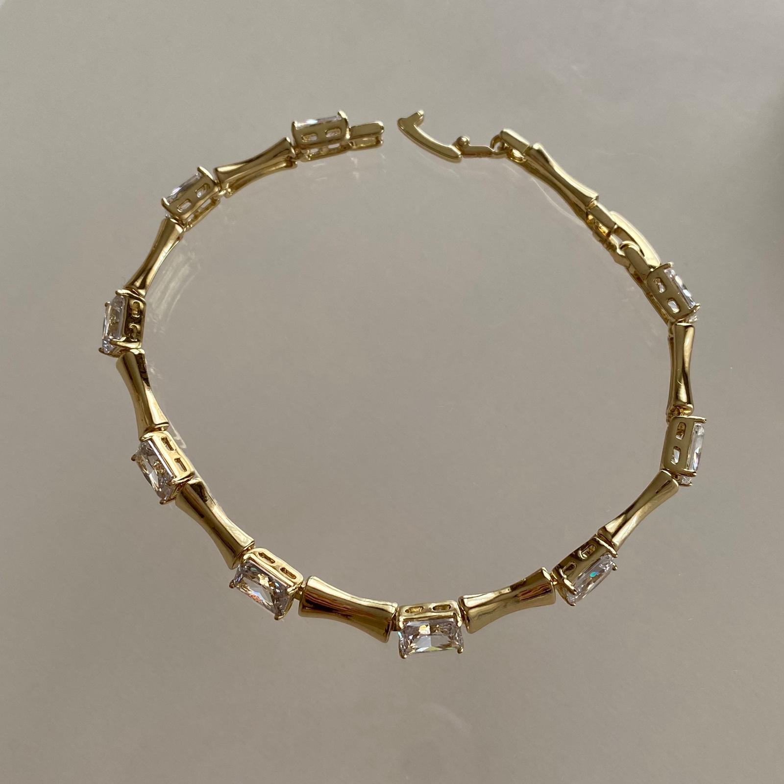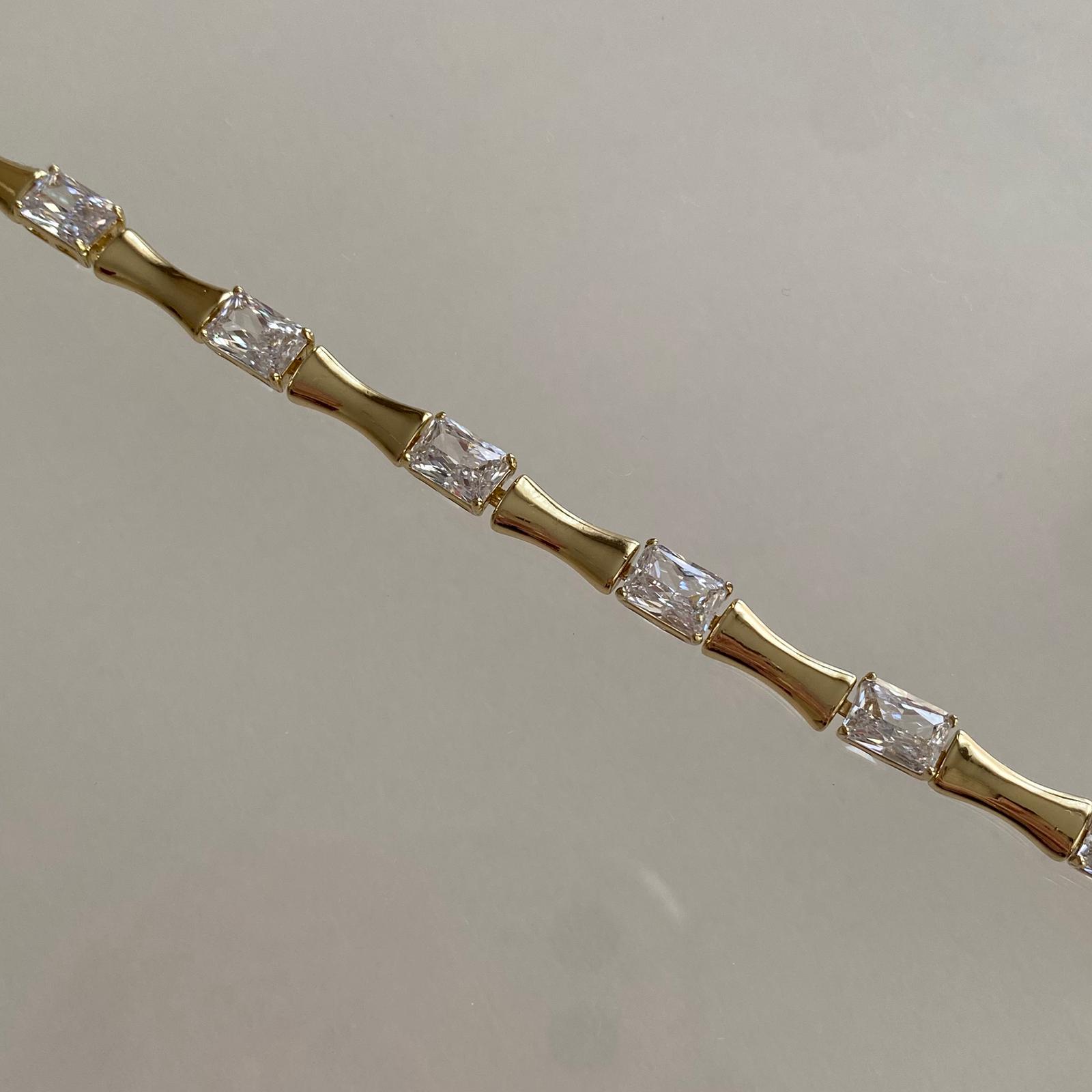 Bu zarif 14K altın kaplama özel tasarım kadın bileklik, bileklik boyunca sıralanan ince çubuk halkalar ve aralarına yerleştirilmiş dikdörtgen baget taş detaylarıyla modern ve şık bir görünüm sunar. Baget taşların pırıltısı, bileklik hareket ettikçe ışığı güçlü şekilde yansıtarak bileğinizde zarif ama dikkat çekici bir ışıltı oluşturur.