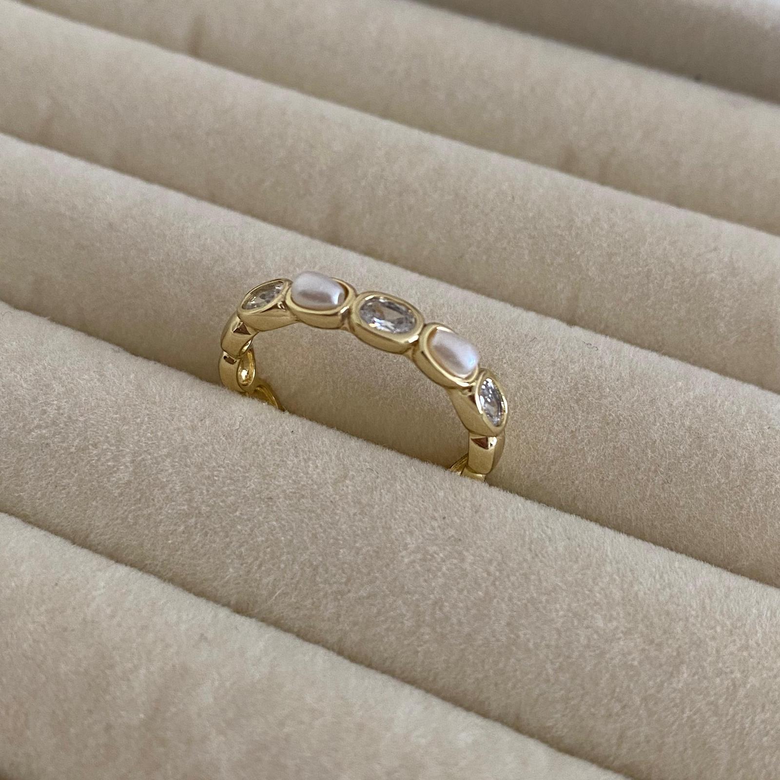 Bu zarif 14K altın kaplama özel tasarım kadın yüzük, üst kısmında sıralanan oval parlak taşlar ve inci görünümlü detaylarla modern ve şık bir görünüm sunar. Dönüşümlü olarak yerleştirilmiş oval taşlar, yüzüğe hem hareket hem de lüks bir ışıltı kazandırırken, bombeli formu parmakta dolgun ve zarif durur. Kaliteli kaplaması sayesinde kararma yapmaz, alerji oluşturmaz ve doğru kullanımda yıllarca ilk günkü parlaklığını korur.