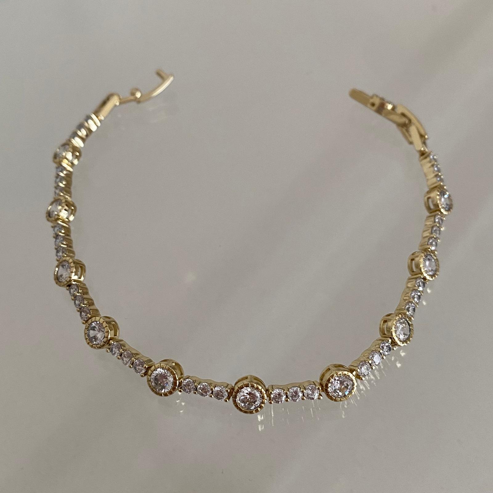 Bu zarif 14K altın kaplama özel tasarım kadın bileklik, bileklik boyunca uzanan yuvarlak taş yuvaları ve aralarındaki ince sıra taş detaylarıyla klasik tenis bileklik formunu modern bir dokunuşla sunar. Her bir yuvarlak pırlanta görünümlü taş, bileklik hareket ettikçe ışığı güçlü bir şekilde yansıtarak bileğinizde zarif ama son derece göz alıcı bir ışıltı oluşturur.