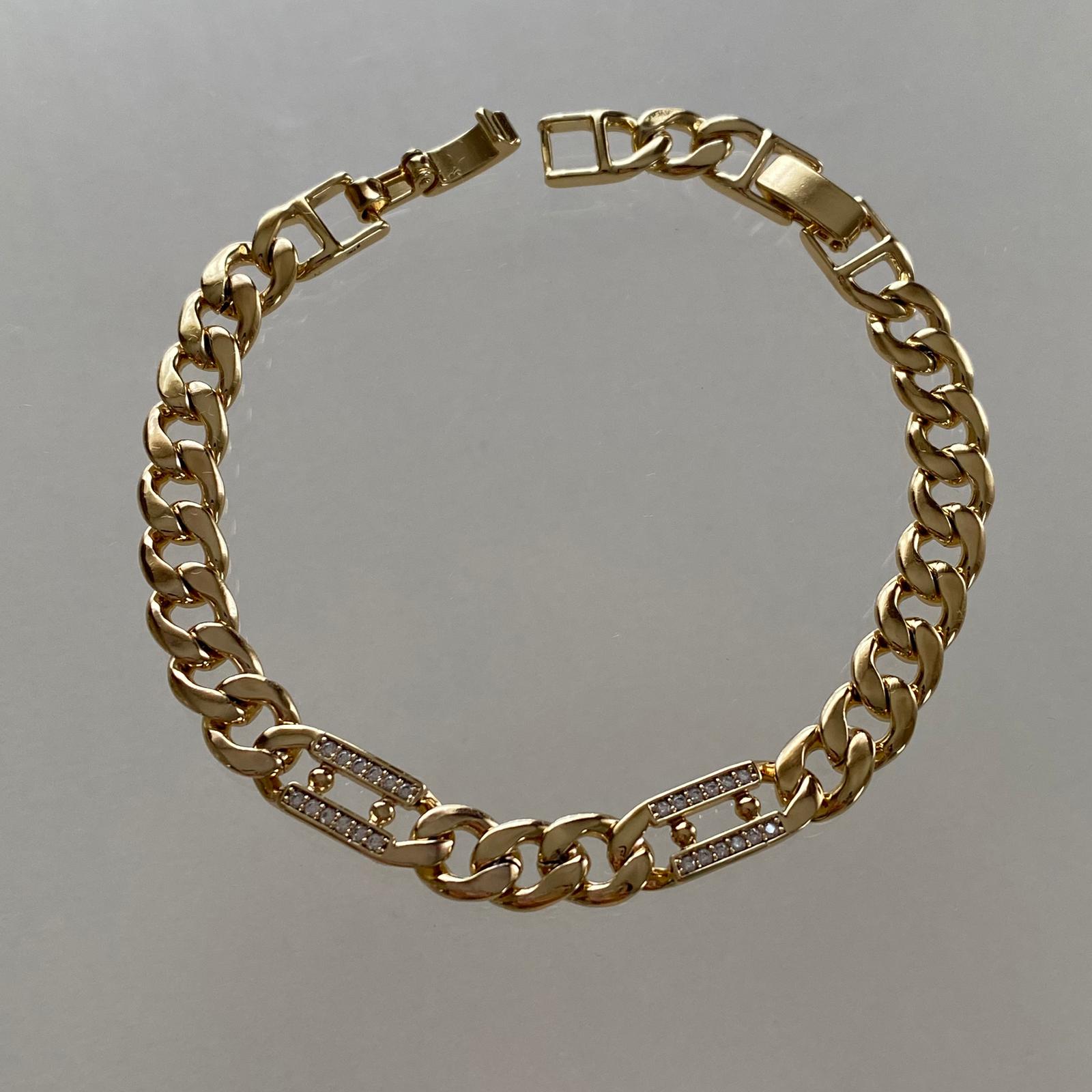 Bu zarif 14K altın kaplama özel tasarım kadın bileklik, klasik kalın zincir formu ve ön kısmındaki taşlarla süslenmiş dikdörtgen plaka detayları ile modern ve şık bir görünüm sunar. Işıltılı bağlantılar bilekliğe lüks bir dokunuş katarken, kaliteli kaplaması sayesinde kararma yapmaz, alerji oluşturmaz ve doğru kullanımda yıllarca ilk günkü parlaklığını korur.