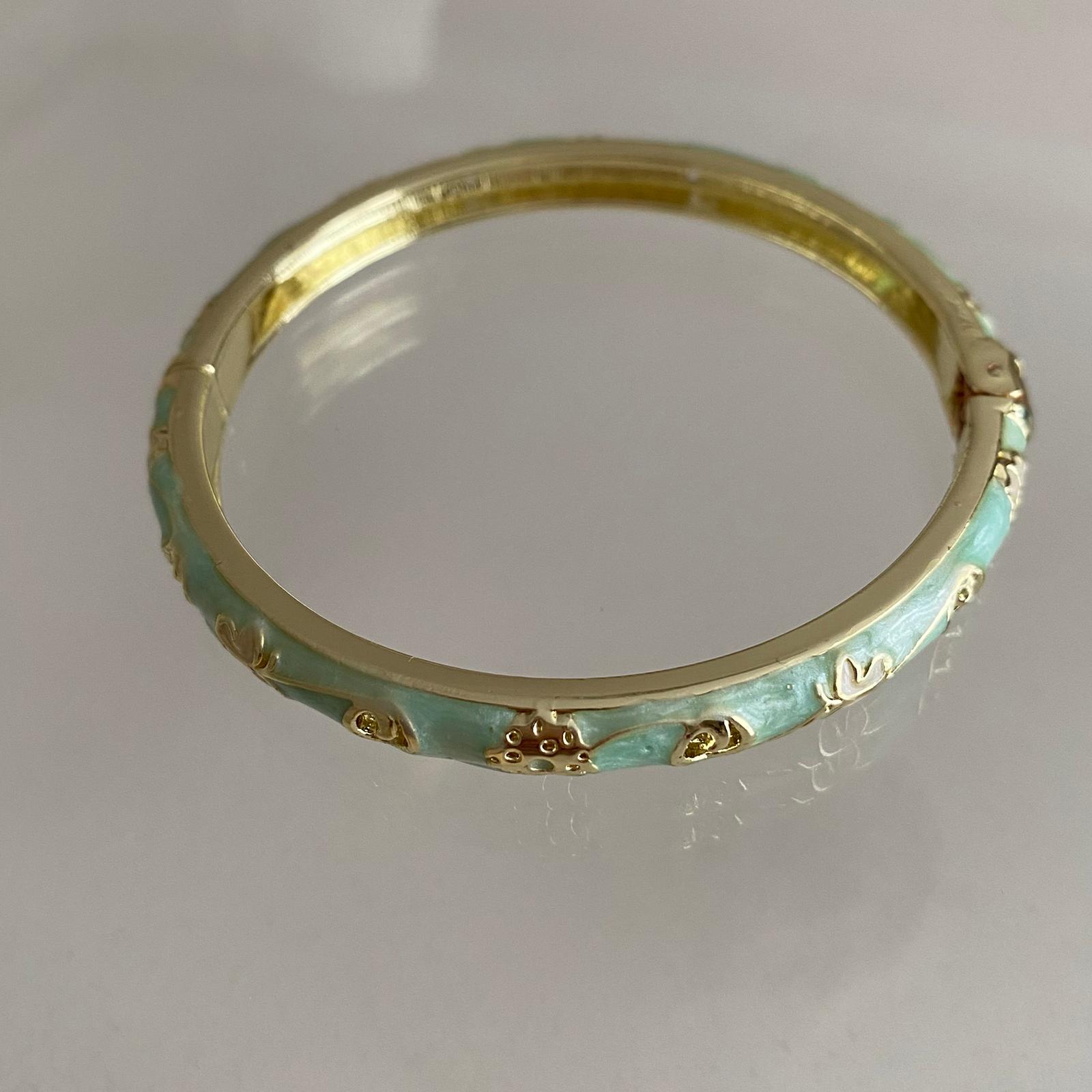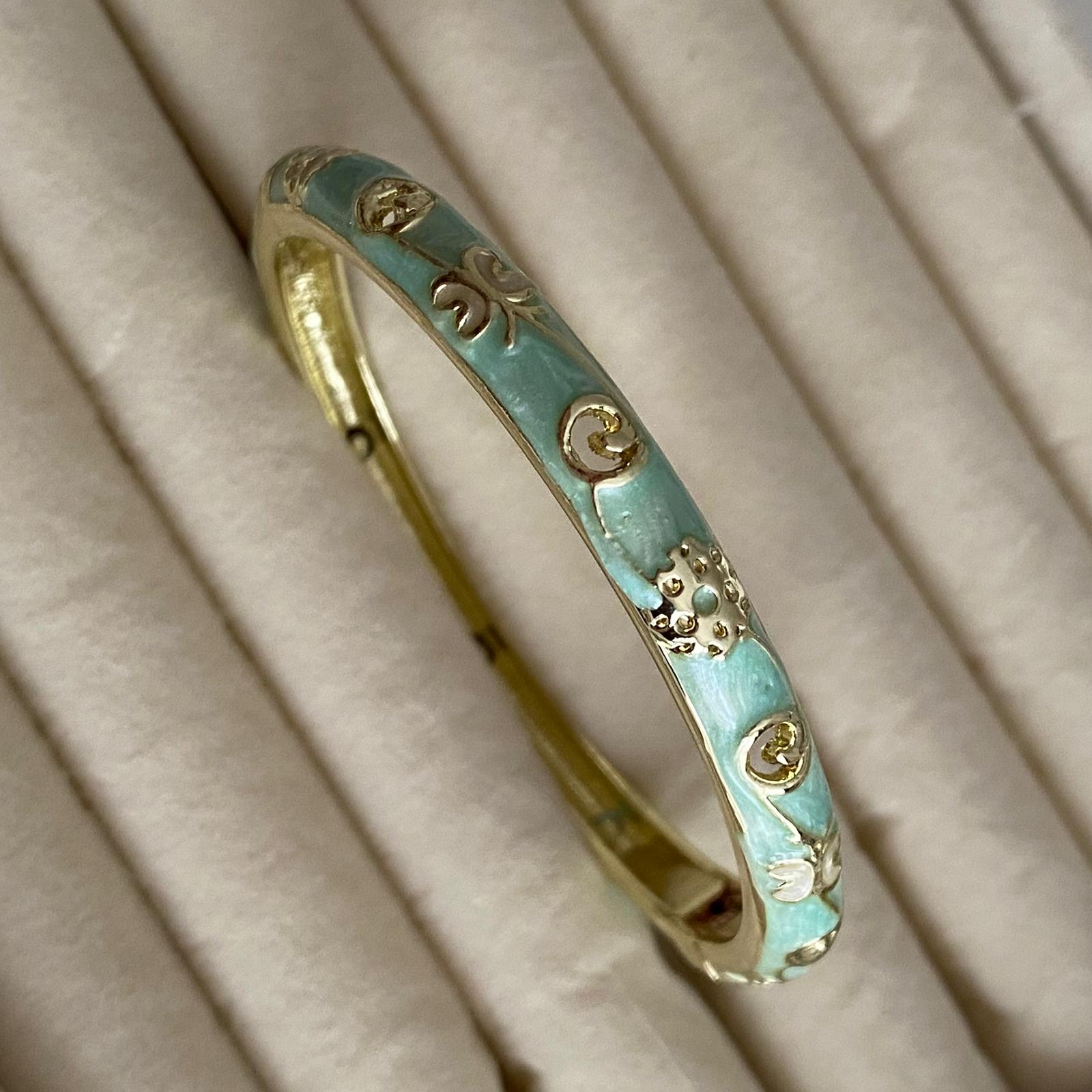 Bu zarif 14K altın kaplama özel tasarım kadın bileklik, pastel mavi mine kaplamalı yüzeyi ve üzerine yerleştirilmiş kabartmalı çiçek motifleriyle romantik ve dikkat çekici bir görünüm sunar. Renkli yüzey ile altın tonunun uyumu bilekte yumuşak ama iddialı bir ışıltı oluştururken, kaliteli kaplaması sayesinde kararma yapmaz, alerji oluşturmaz ve doğru kullanımda yıllarca ilk günkü parlaklığını korur.