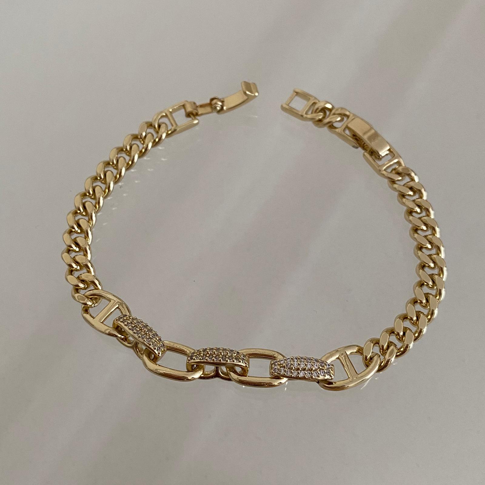 Bu zarif 14K altın kaplama özel tasarım kadın bileklik, bir yanında klasik zincir formu, ön kısmında ise iri oval halkalar ve taşla süslenmiş bağlantı detaylarıyla modern ve şık bir görünüm sunar. Parlak düz halkalar ile ışıltılı taşlı parçaların uyumu, bilekliğe lüks ve dikkat çekici bir parıltı kazandırırken, kaliteli kaplaması sayesinde kararma yapmaz, alerji oluşturmaz ve doğru kullanımda yıllarca ilk günkü parlaklığını korur.