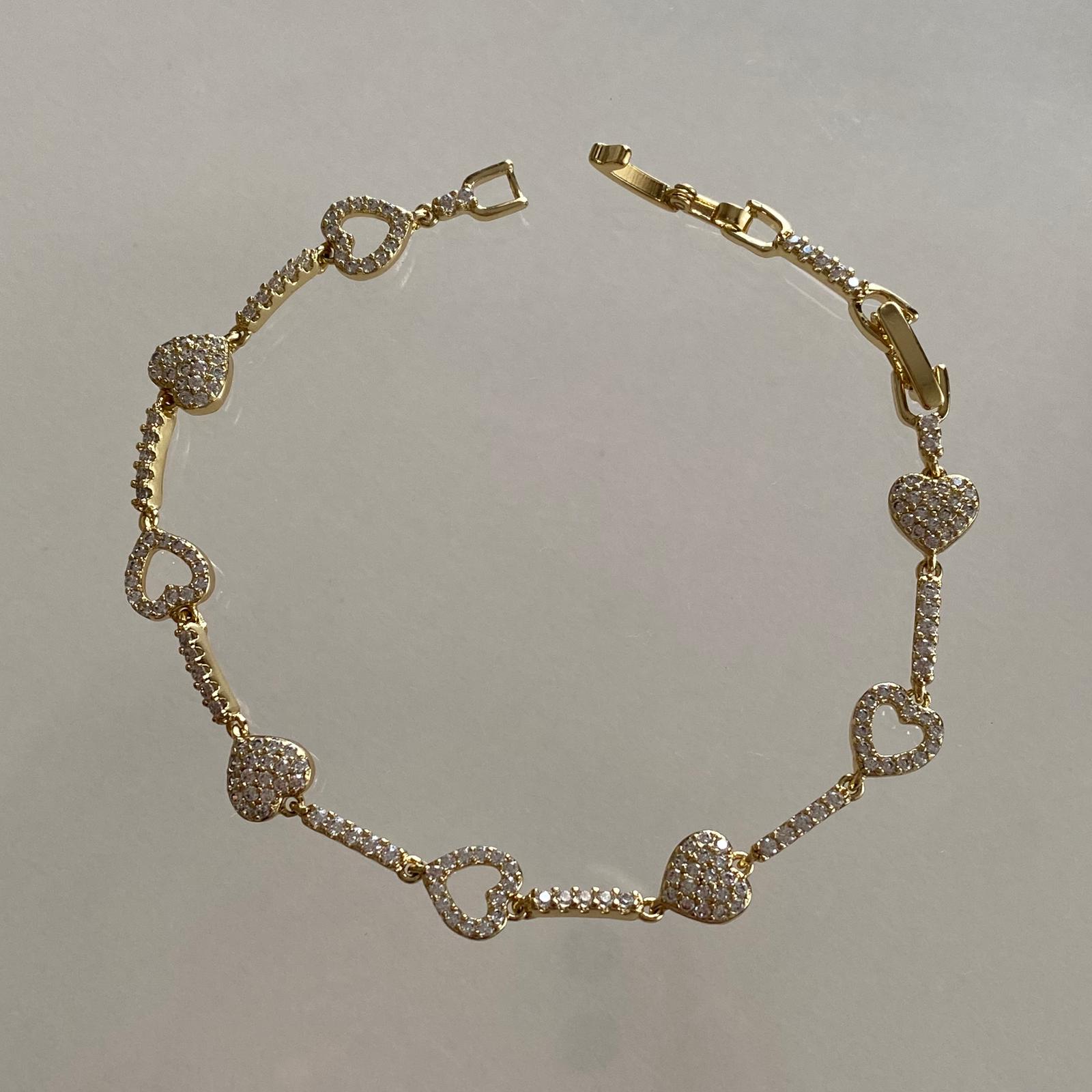 Bu zarif 14K altın kaplama özel tasarım kadın bileklik, ince zinciri boyunca sıralanan taşlı kalp figürleriyle romantik ve feminen bir görünüm sunar. Pırlanta etkili parlak taşlarla süslenen kalpler, bileklik hareket ettikçe ışığı yakalayarak bileğinizde göz alıcı bir ışıltı oluşturur.