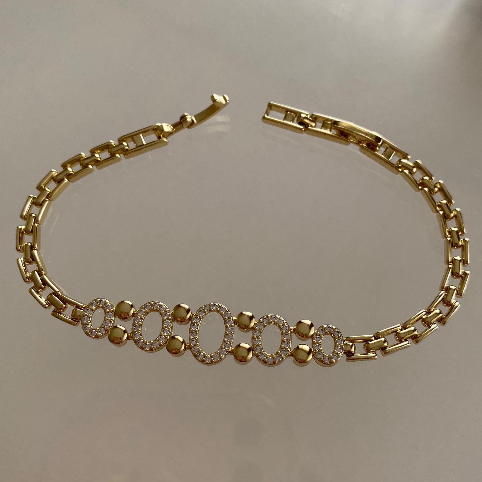 Bu zarif 14K altın kaplama özel tasarım kadın bileklik, modern dikdörtgen zincir formu ve ortasında yer alan taşlı oval halkalardan oluşan şık tasarımıyla bilekte dikkat çekici bir ışıltı sunar. Ortadaki pırlanta efektli oval halkalar ile aralarına yerleştirilen parlak gold parçalar, bilekliğe hem lüks hem de zarif bir hava katar.