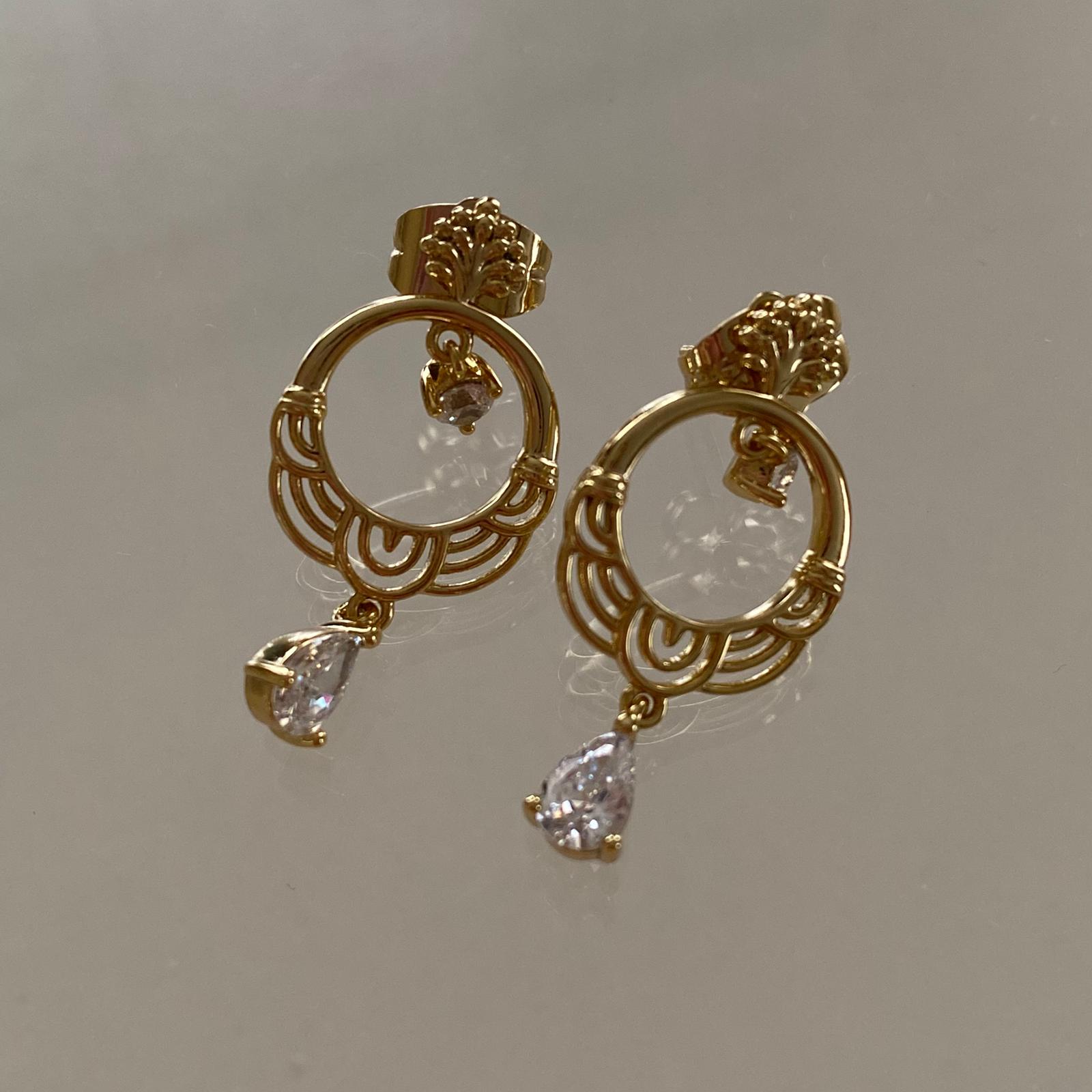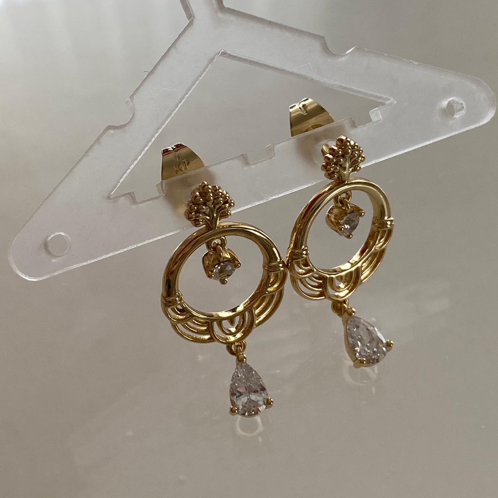 Bu zarif 14K altın kaplama özel tasarım kadın küpe, üst kısmındaki çiçek formu, ortasında yer alan yuvarlak taşlı halka ve en alttaki damla taş detayıyla son derece gösterişli ve şık bir görünüm sunar. Hareket ettikçe ışığı farklı açılardan yansıtan bu tasarım, özellikle özel gün ve gece kombinlerine lüks bir ışıltı katar. Kaliteli kaplaması sayesinde kararma yapmaz, alerji oluşturmaz ve doğru kullanımda yıllarca ilk günkü parlaklığını korur.