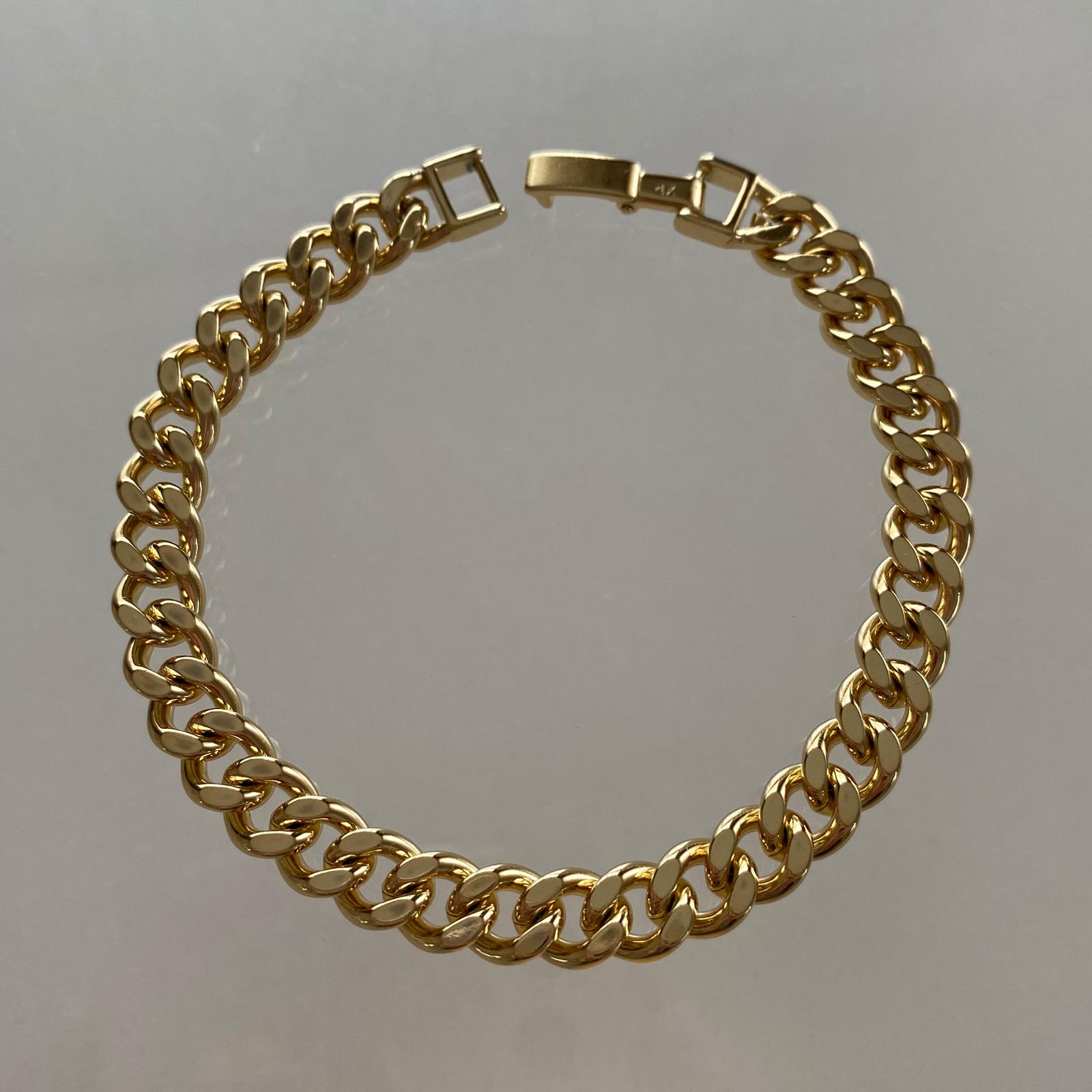 Bu zarif 14K altın kaplama özel tasarım kadın bileklik, modern ve sade kalın zincir formu ile dikkat çeker. Düz ve parlak halkaları bileğe güçlü ve şık bir görünüm kazandırırken, kaliteli kaplaması sayesinde kararma yapmaz, alerji oluşturmaz ve doğru kullanımda yıllarca ilk günkü parlaklığını korur.